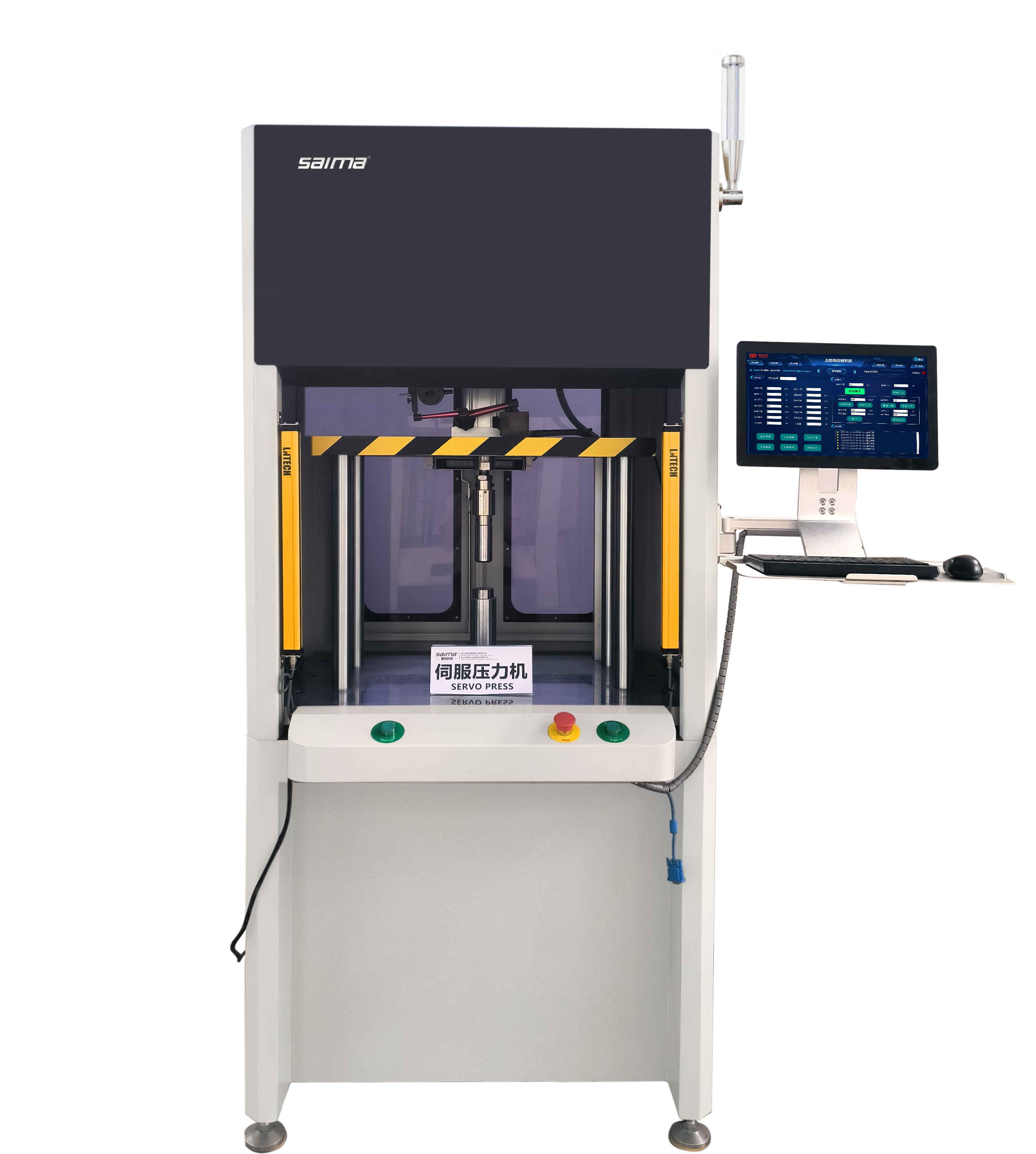 伺服壓力機(jī)是采用具有 PID 防過沖(過壓)功能的伺服電機(jī)系統(tǒng)作為驅(qū)動(dòng)的動(dòng)力源,結(jié)合復(fù)雜多元化電氣系統(tǒng)的完美控制及機(jī)械的精確動(dòng)作,通過高精度研磨滾珠絲杠把回轉(zhuǎn)力量改變?yōu)榇怪狈较蜃鲋本€運(yùn)動(dòng)轉(zhuǎn)換而來,依靠裝載于驅(qū)動(dòng)部位前端的壓力傳感器監(jiān)控管理壓力,依靠編碼器控制管理位置,再加上伺服電機(jī)全過程運(yùn)轉(zhuǎn)數(shù)字化閉環(huán)控制,同時(shí)向工作對(duì)象施加壓力,從而使壓裝機(jī)達(dá)到加工柔性化、智能化目的的裝置,能隨時(shí)精確控制,壓裝壓力/停止位置/壓裝速度/壓裝時(shí)間,能夠在壓力裝配作業(yè)中實(shí)現(xiàn)壓裝力與壓入深度的全過程閉環(huán)控制,集預(yù)裝、定位、壓裝、裝配、測(cè)量、統(tǒng)計(jì)、分析、糾錯(cuò)、保護(hù)、反饋、更新于一體,全面詮釋了精密壓裝領(lǐng)域的各個(gè)要點(diǎn),具備超程、超載、超設(shè)定等報(bào)警功能,采用友好人機(jī)界面的大尺寸觸摸屏直觀易操作,裝有安全光幕及可拆卸式防護(hù)網(wǎng),在壓裝過程中如有身體部位伸入壓裝區(qū)域壓頭將自動(dòng)返回保證操作安全。